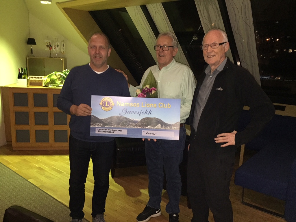 President Åge Rygh overrekker en sjekk på kr. 20000,- til Selskapet til Namsos by`s forskjønnelse ved Steinar Høknes og Tomas Bangsund.